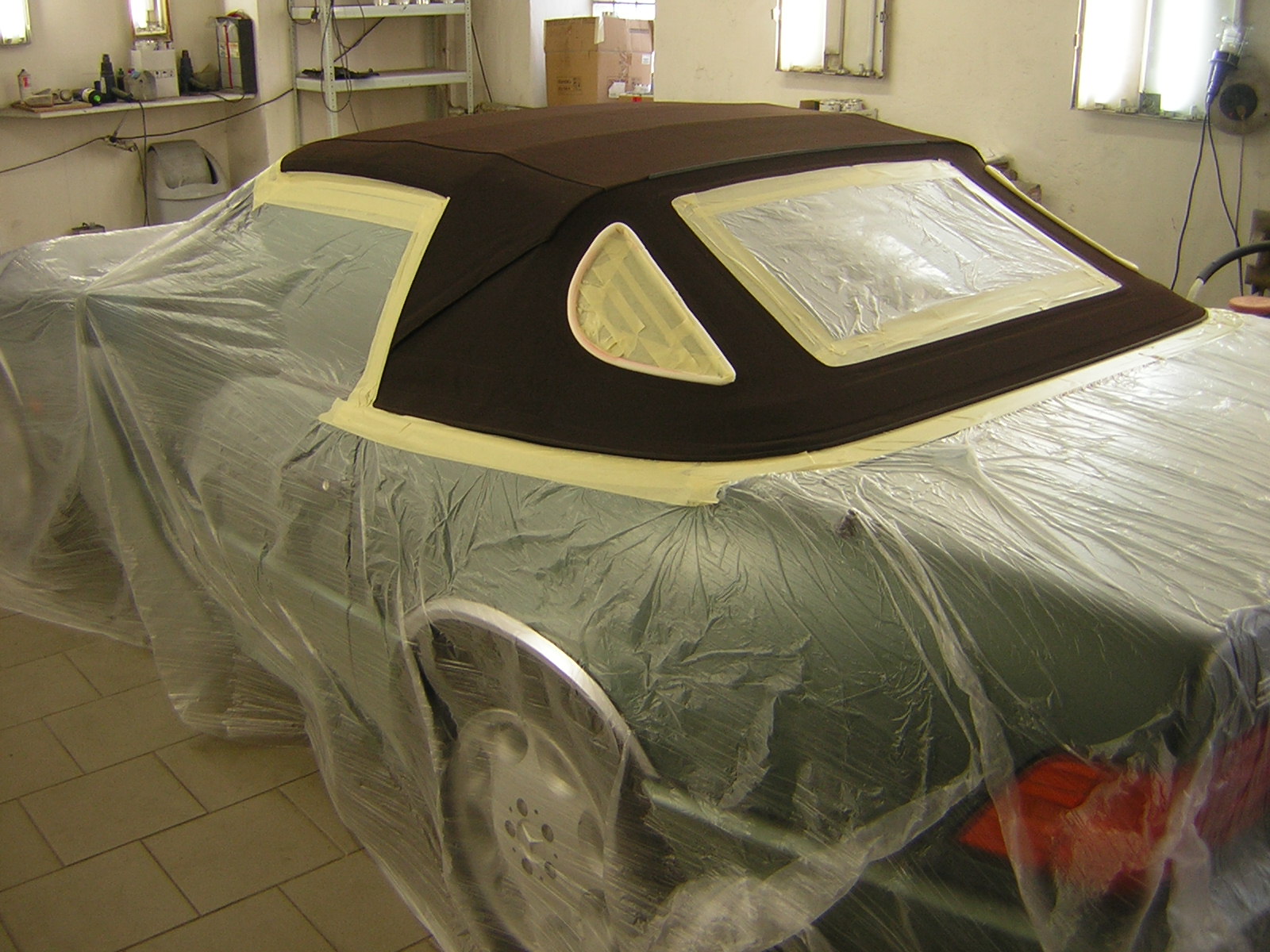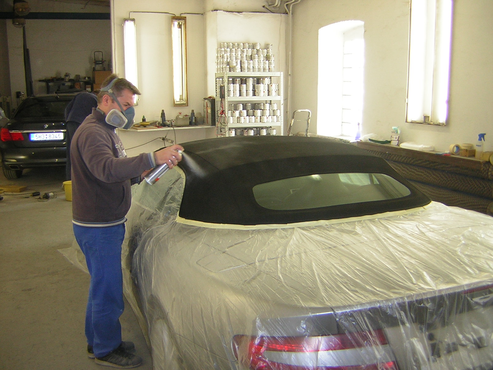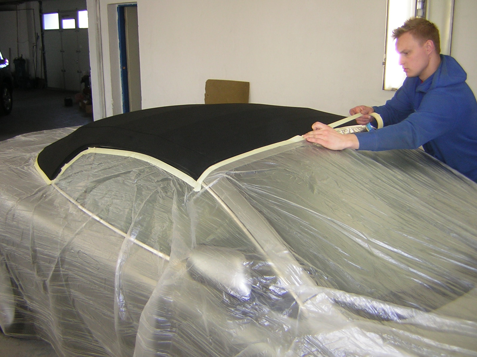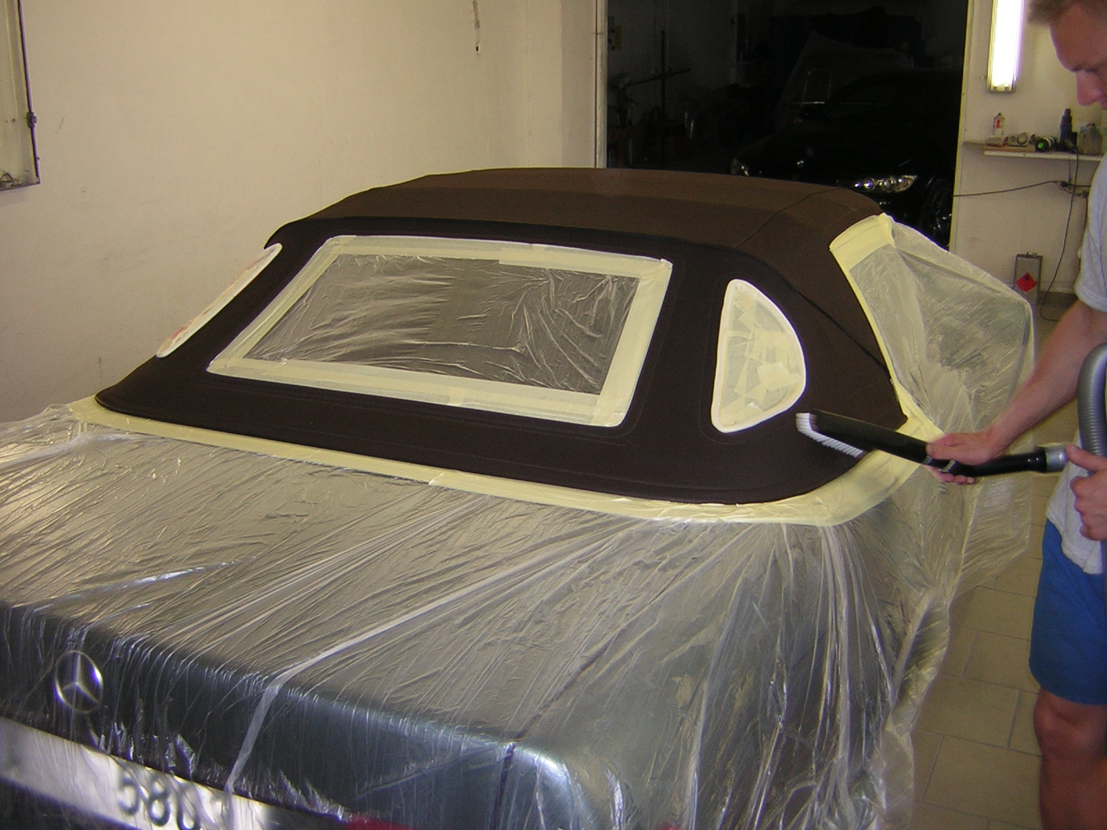 U kabrioletu vždy nejprve ochráníme místa, s nimiž chemie nesmí přijít do styku a teprve potom se pustíme do práce.
